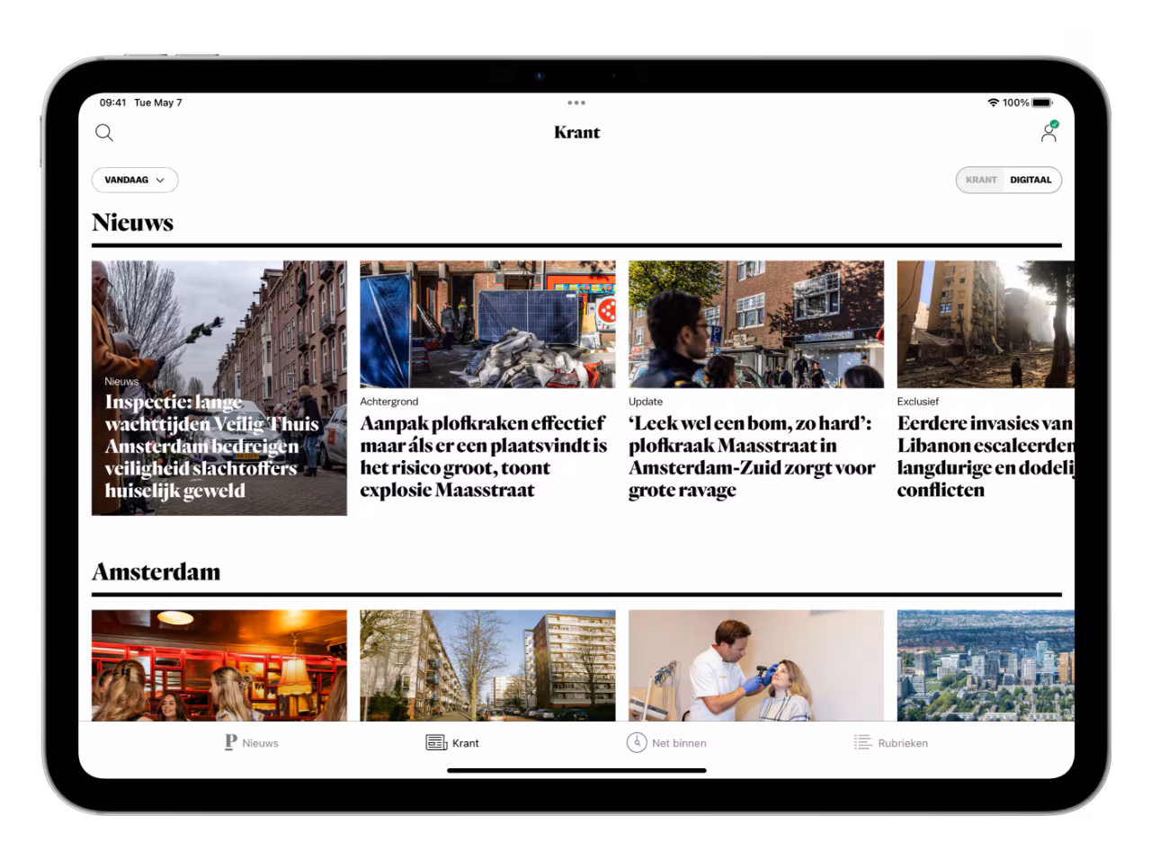 Bij de Digitale Krant leest u de krant van vandaag, maar dan interactief en verrijkt met beeld- en geluidsmateriaal. U vindt de Digitale Krant achter het krant-icoontje onder in de nieuwsapp en rechtsboven op onze homepage. Ook vindt u hier vanaf 5 uur 's ochtends de pdf-versie van de krant, precies zoals deze op de mat belandt - maar dan digitaal en met klikbare artikelen.